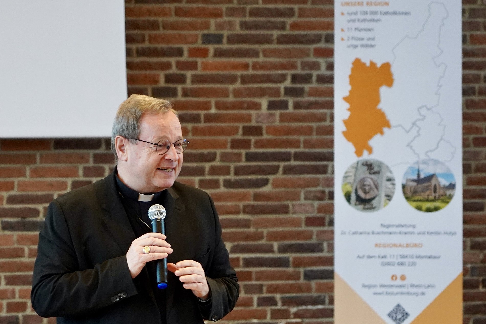 Der Regionentag stand unter dem Leitwort „Mittendrin – Kirche sein heute“. Bischof Dr. Georg Bätzing hat die Region ein Jahr nach der Errichtung besucht und erlebt, was bereits in dieser Zeit entstanden ist. Er ermutigte die Engagierten, er unterstützte und gab einen Impuls für die weitere Entwicklung. Vor allem ging es am Regionentag auch darum, miteinander ins Gespräch zu kommen und mehr von der Lebenswirklichkeit in der Region zu erfahren. Daher stand auch der gemeinsame Besuch auf dem Weihnachtsmarkt von Montabaur auf dem Programm.